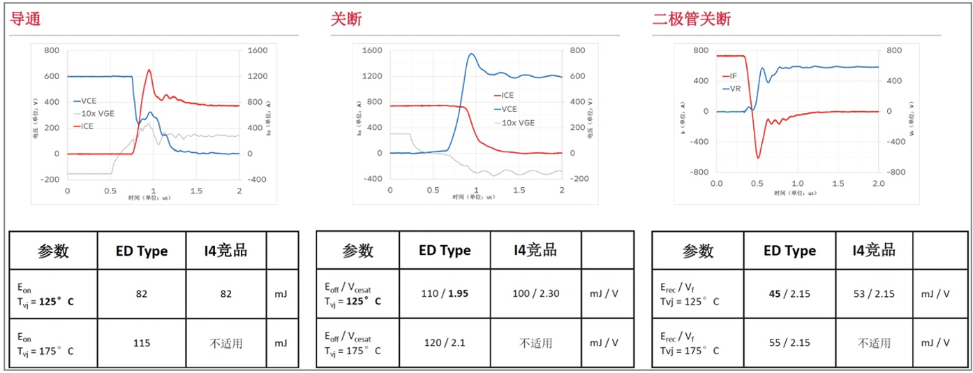 為了驗(yàn)證i20和d20芯片組開關(guān)特性優(yōu)越性,賽晶科技在已經(jīng)量產(chǎn)的1200V 750A ED系列模塊SISD0750ED120i20上與行業(yè)國際領(lǐng)軍企業(yè)同款I(lǐng)GBT4的同平臺(tái)模塊進(jìn)行了對比測試,需要說明的是IGBT4模塊目前最高結(jié)溫只有150℃。通過對比發(fā)現(xiàn)兩個(gè)模塊開通損耗基本相當(dāng),關(guān)斷損耗采用i20芯片組的ED模塊略高,但飽和導(dǎo)通壓降的ED模塊更低。基于d20芯片組ED模塊二極管與IGBT4具有相同的正向壓降,且能夠保持更低的反向恢復(fù)損耗,從測試來看采用i20和d20芯片組模塊要優(yōu)于國際領(lǐng)軍企業(yè)的同類第4代IGBT模塊。