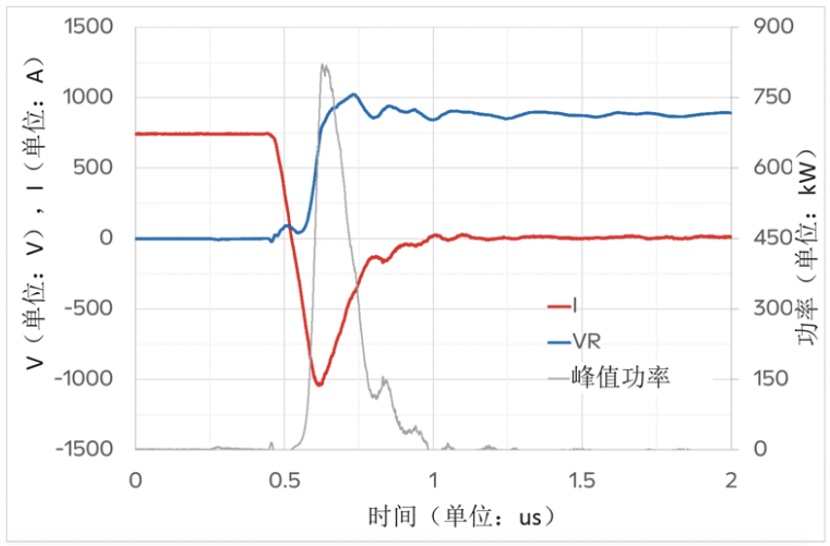 二極管的安全工作區(qū)主要取決于二極管的開關(guān)特性。為了評(píng)估二極管的穩(wěn)健性,通過將外部柵極電阻Rgon減小到最小值,然后增加?xùn)艠O電壓Vge,從而提高二極管的換向速度。對于選定的極端情況:750A的電流和900V的反向電壓,IGBT開通電壓21V,進(jìn)行雙脈沖測試。實(shí)驗(yàn)發(fā)現(xiàn):在175°C的外殼溫度下,二級(jí)管的峰值功率超過800kW,di/dt超過10kA/us,器件依然可以穩(wěn)定。選定的測試條件遠(yuǎn)遠(yuǎn)超出了任何數(shù)據(jù)表建議,進(jìn)一步體現(xiàn)了賽晶科技d20芯片組的高可靠性。