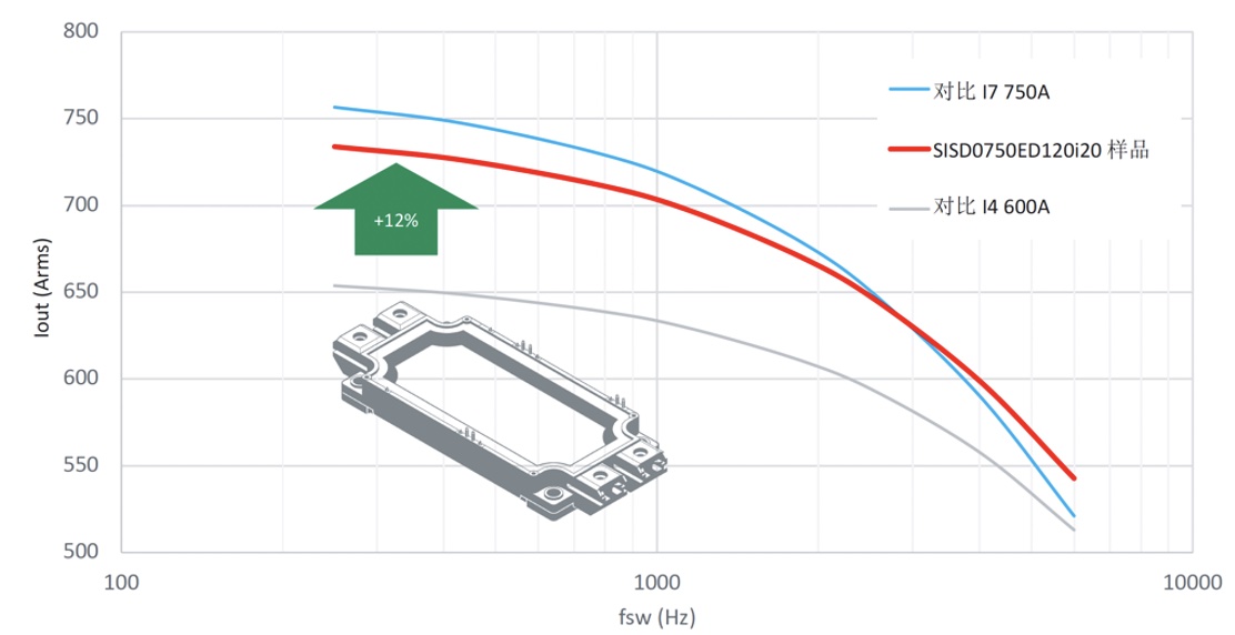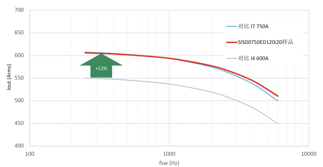 為了在系統(tǒng)應(yīng)用層面驗(yàn)證i20和d20芯片組的性能,將基于i20芯片組的ED型750A半橋模塊與競爭對手i4-600A和i7-750A兩款模塊分別在整流模式和逆變模式進(jìn)行了對比仿真。性能曲線圖反映了逆變器輸出功率(或電流)與開關(guān)頻率的關(guān)系,仿真熱阻值取自數(shù)據(jù)表,而器件的靜態(tài)和動(dòng)態(tài)損耗取自測量值。逆變工況下,ED-750A額定模塊在最壞的情況下比最先進(jìn)的i7 740A模塊功耗低3%,當(dāng)開關(guān)頻率直到3kHz時(shí)達(dá)到平衡。而與目前應(yīng)用居多的i4-600A模塊相比,ED型模塊能夠提升超過10%的性能。在整流器模式下,賽晶科技ED模塊的性能與最新的i7-750A模塊基本一致,相比i4-600A模塊相比,性能同樣可以提高10%以上。